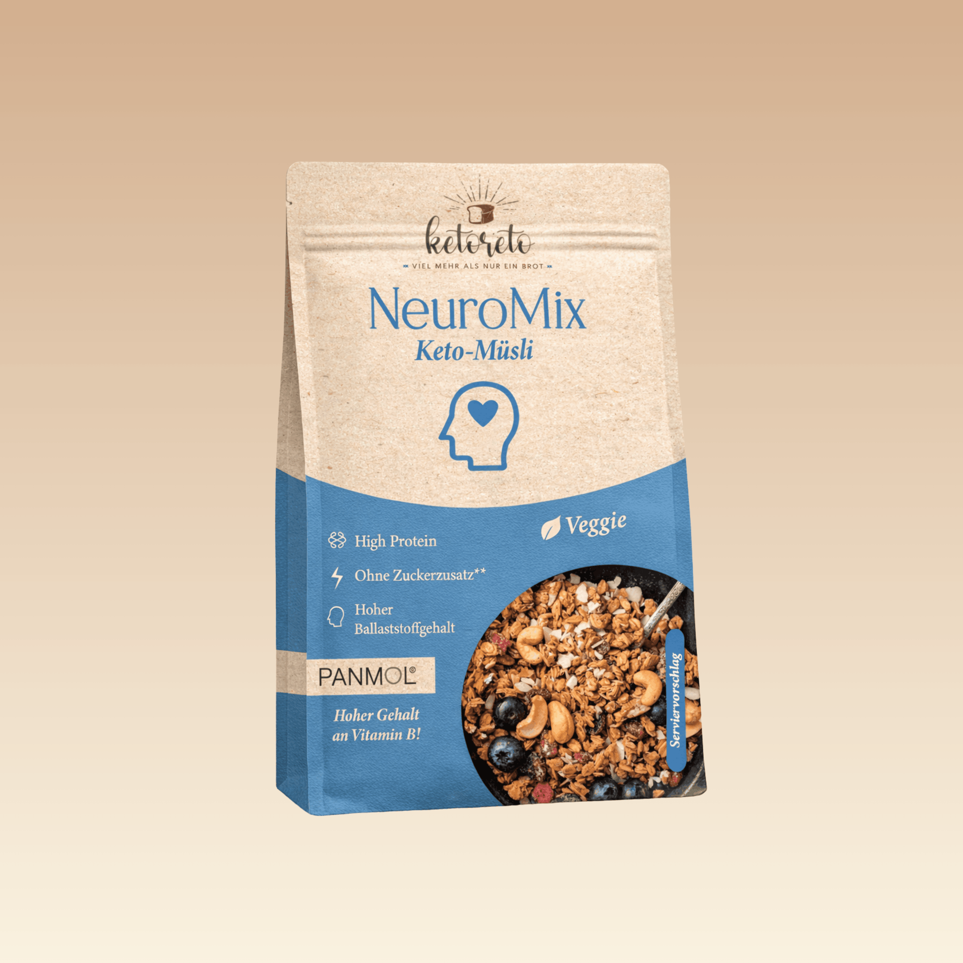 Unser NeuroMix, verfeinert mit Kokoschips & gefriergetrockneten Beeren, ist der perfekte smarte Begleiter mit WOW-Effekt. Angereichert mit dem pflanzlichen PANMOL B-COMPLEX & high Protein mit 26% Protein des gesamten Brennwertes auf 100g.